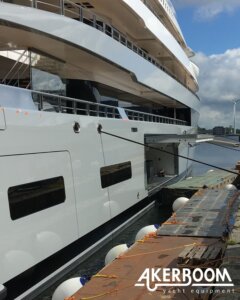 In total, Akerboom delivered 14 watertight solutions, including six platforms, five hatches and three doors, all class‑approved, hydraulically operated and equipped with control and back‑up systems. Additional deliveries included tender limousine storage with a large tender hatch and beam cranes, silent closed‑loop shaftlines, rescue boat systems, life‑raft racks, a retractable foremast, a retractable boat boom and seven large composite hatches.